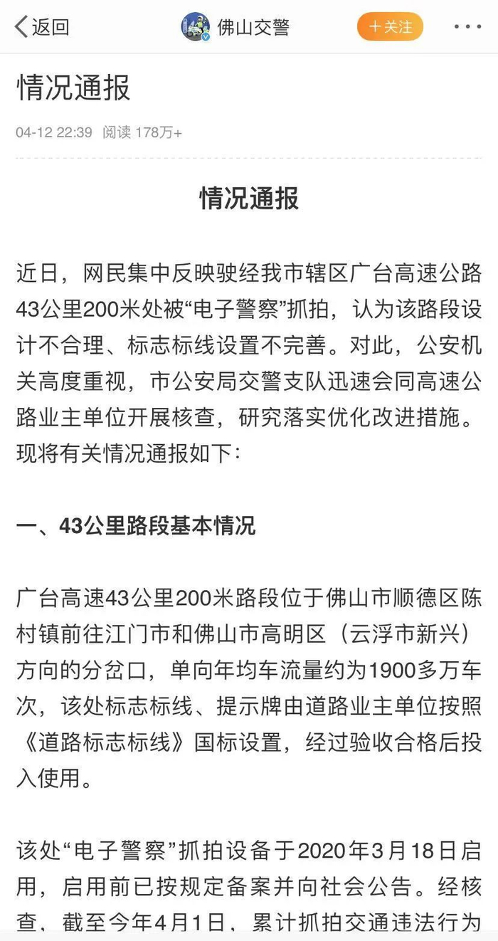 对此,广东佛山交警昨日晚间10点在其官方微博进行回应,全文如下: