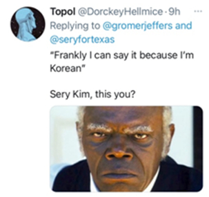 参选美国国会众议员的韩裔美国人萨莉·金,在一次竞选议员的候选人论坛上曾公开攻击同为亚洲人的华裔。她当时宣称,中国人“传播病毒”、“窃取知识产权”、“带来新冠病毒”,还大言不惭地说她是韩裔,所以就可以攻击中国人。这番言论很快引起了网友愤怒,有人直接将其比作电影《被解救的姜戈》中迫害自己同类的黑人管家↓↓