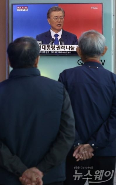 2017年5月10日,韩国民众在凝神观看文在寅总统就职典礼电视现场直播。