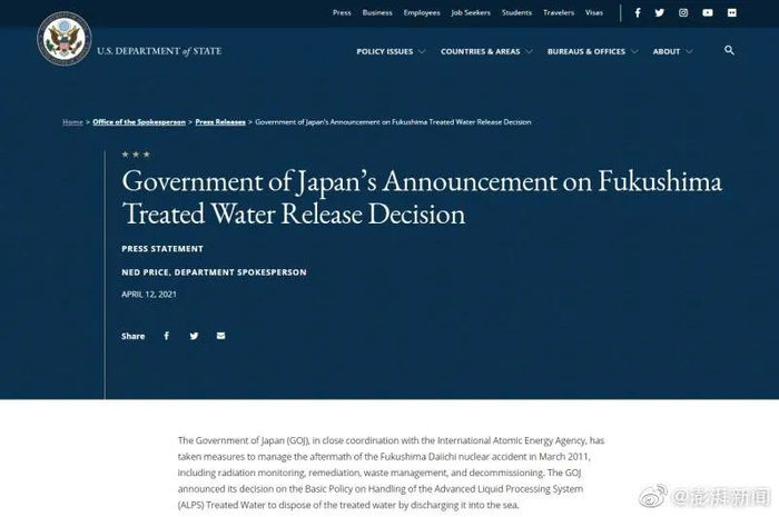 美国务院在日本政府正式宣布上述决定之后,在官网发布声明称,“日本政府与国际原子能机构(IAEA)密切合作,已采取措施对2011年3月福岛第一核电站核事故的后果进行处理。日本政府已宣布关于ALPS(多核素去除设备)处理水的基本政策的决定,将处理后的核污水排入大海。”