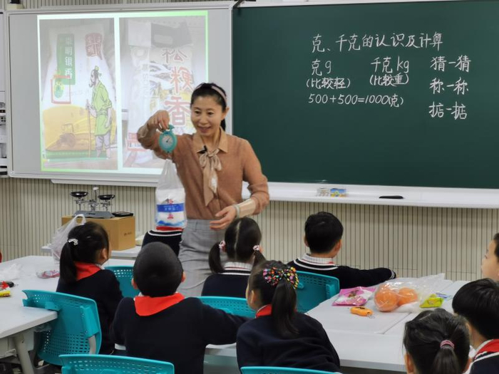 崔老师还特别提醒,“1000克”等于“1千克”,但在读数方面应该有所区分。通过重音强调和间隔时间的差异,她演示了“1000克”和“1千克”不同读法。从薯片到护手霜,从芒果到固体胶,崔玉秋展示生活中常见物品的克重,也请学生动手用弹簧秤等工具称一称,甚至让他们起身离座,各人抬起椅子,感受重量感。