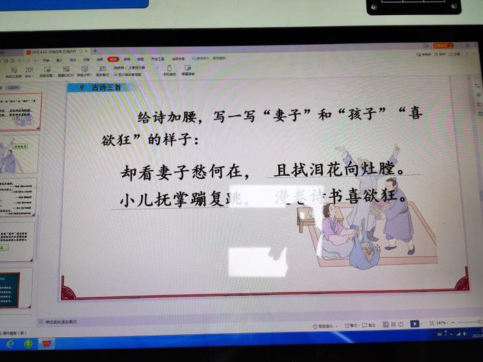 令现场师生惊叹的是,宁锋创造性地拓展“一题”,希望给诗加一个“腰”,描摹出杜甫妻子和孩子“喜欲狂”的样子。同学们你一言、我一语,想象着杜甫与妻儿之间的对话。说话间,宁锋在原诗之上加了自己创作的“诗腰”:“却看妻子愁何在,‘且拭泪花向灶膛;小儿抚掌蹦复跳,’漫卷诗书喜欲狂。”