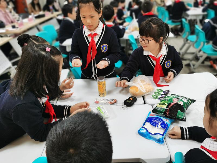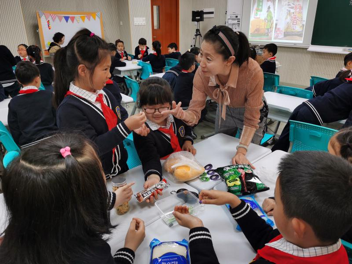 在另一位教授级的小学老师、“全国模范教师”崔玉秋课堂上,学生们围坐在小桌子拼接的讨论桌边。只见每个桌上有一大包薯片,还有两袋食用盐……另外一个小盒子里,则装了一些“小零碎”:2分钱硬币,一粒圆纽扣,一颗花生米,以及一枚回形针等。