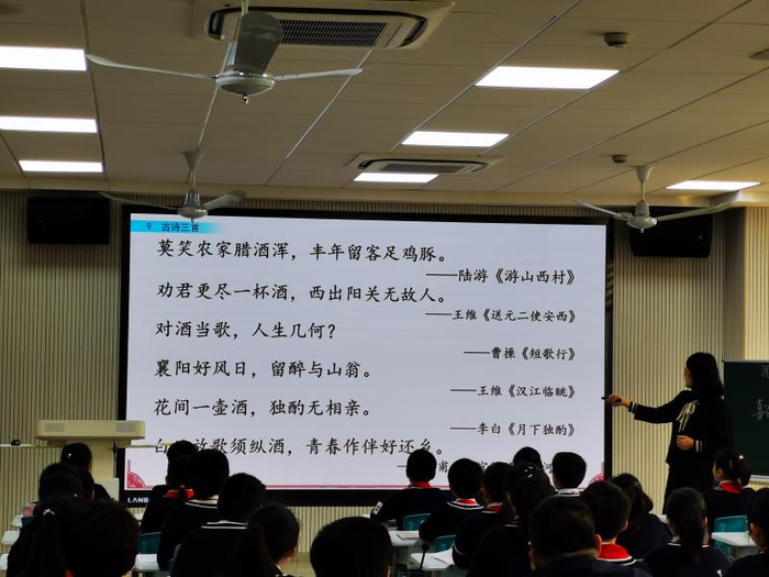 中华诗文博大,还需旁征博引。宁锋又抛出问题,从喜极而泣到放歌纵酒,杜甫的“酒”和曹操、李白、王维其他诗人喝的酒有何不同?她一连举出“对酒当歌,人生几何”“花间一壶酒,独酌无相亲”“劝君更尽一杯酒,西出阳关无故人”等5个名句,请学生体会杜甫诗中难得一见的“喜欲狂”。