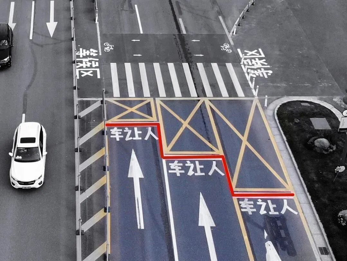 余杭交警大队交大城东二中队副中队长徐军介绍,“通过隔离设施,行进路线变成‘Z’字形,目的是为了达到‘绕起来、慢起来、看起来’的效果,减缓电动车和行人进入机动车道的时间,让机动车能有更加充裕的时间,观察需要横穿马路的行人或电动车,以及停车让行。”对于设置“Z”字形斑马线