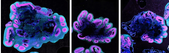 从左至右分别为人、大猩猩和黑猩猩的大脑类器官,人类的明显大于后两者。