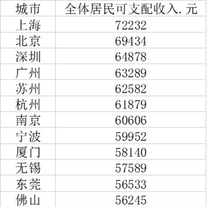 来自华南的两个一线城市深圳、广州与沪京存在一定距离,两市的人均收入分别为64874元和63289元。