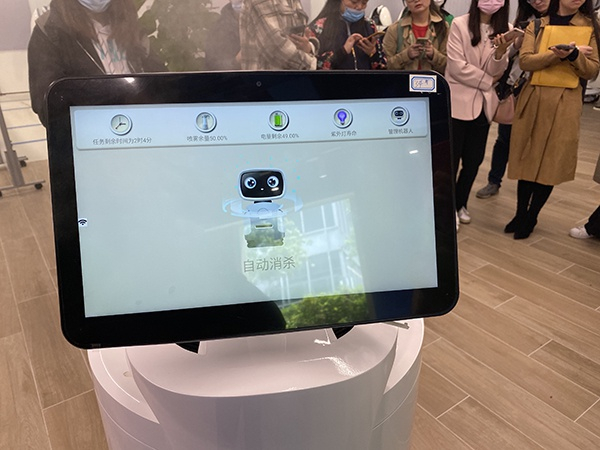 为了简便设置操作,研发人员为这款机器人配套了平板端配置,可通过平板电脑上的机器人一体化调度及运营平台,快速设置消杀时间、路径等计划,随时随地进行远程机器人调度及状态监控。