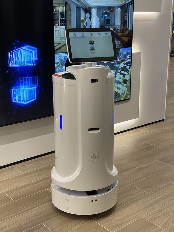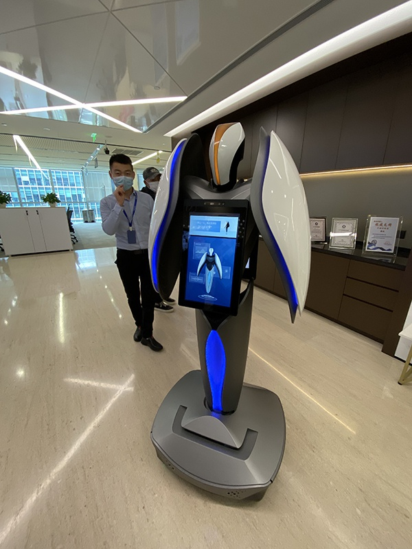 在5楼的云绅智能办公楼层,杜磊向大天使下达了“请带记者前往520”的语音指令,只见大天使智能服务机器人听到后心领神会,一边说“好的,全程16米,现在带你们过去,请跟随我哦”,一边轻盈前行、转弯、停靠在520会议室门口,然后说道:“目的地已到”。