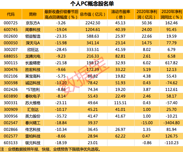 根据证券时报·数据宝梳理,布局个人计算机业务的A股有19家。总市值合计5856.36亿元。京东方A以2242.5亿元市值居首,昨日,京东方A发布了2020年报和今年的第一季度业绩预告,根据报告内容显示,经过近28年发展,京东方已成为全球半导体显示领域龙头,显示屏幕总出货量稳居全球第一。京东方2021年一季度净利预计同比增长782%-818%,归母净利润额预计为50亿-52亿元。