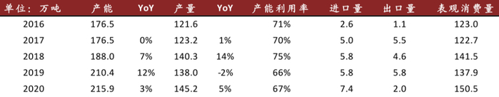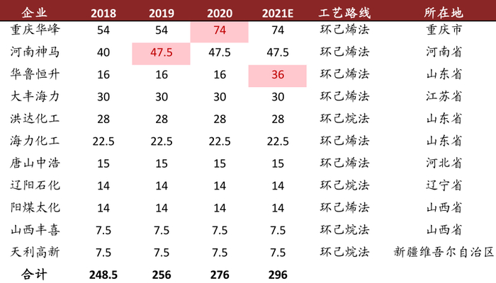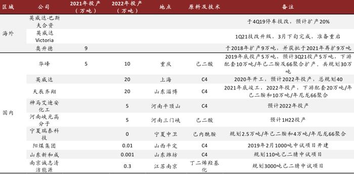 (2)供给:我们认为华鲁16万吨己二酸装置于1Q21投放后,华峰化学25.5万吨己二酸装置计划于2H21投放,除此之外2021-2022年行业无新增产能计划。