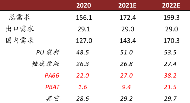 (1)需求:我们认为随着2021年大量PBAT投产及2022年己二腈突破后的尼龙66项目投产,我们预期2021/22年行业需求增速有望达到13%/19%。