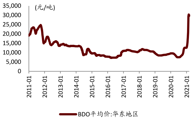 2020年7月至今,BDO价格从7500元/吨上涨至31000元/吨,市场关注度高。主要原因系:(1)氨纶需求强劲,拉动PTMEG需求,向上游传导;(2)PBAT产能的快速扩张开始,2020年末恒力3.3万吨、金发6万吨相继投产;(3)供应端控价,报价机制改为竞价机制,推高价格。