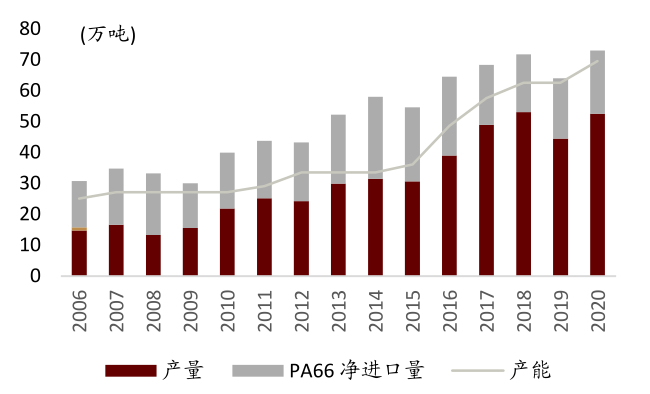 中国用量达73万吨/年,严重依赖进口。至2020年,我国尼龙66的消耗量约为73万吨,其中国内生产53万吨(包含英威达上海近20万吨产量),此外20万吨依靠进口。