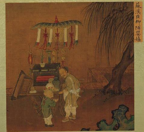 波士顿博物馆的吴同先生认为,货郎图一类的风俗画,在南宋时大行其道,显然是受了当时民生富裕、经济繁荣的影响。宋室南渡后的新都临安,不但是政教文化中枢,也是商贸货运集中地,经由贸易致富的商人云集其间。此一新兴阶级对绘画的欣赏,每每偏爱风俗画,货郎图即其一种。货郎百物杂陈、无所不卖,为了推销百货,招徕妇孺老少顾客,其身手表情,每作戏剧性的夸张。画家生动细致的描绘,正中商贾购画欣赏的心怀。