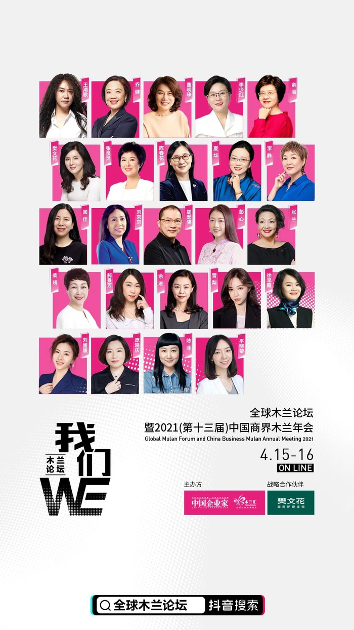 4月15日、16日,董明珠、王潮歌、李少红、乔健、俞渝、陈春花、夏华、张兰、张泉灵、雪梨等热门话题姐姐们跨界集结,全球木兰论坛全程抖音直播,关注“中国企业家杂志”抖音号,不错过精彩直播。