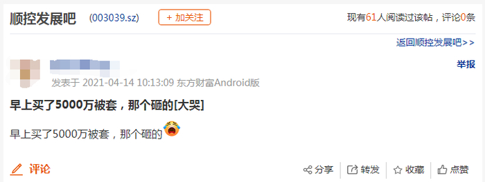有网友庆幸,“还好今天手快”,“56.83,58.87全部卖光光,清仓了。哈哈哈。红盘以上清仓就是赢”。也有网友哭诉,“早上买了5000万被套,那个砸的”。还有网友在期待,“坐等地天板”。