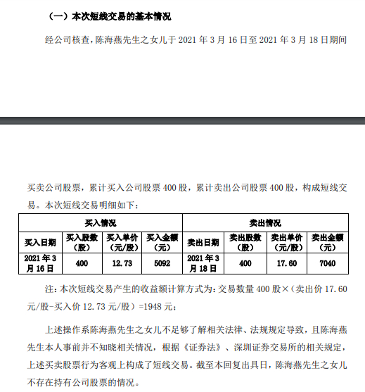 4月2日晚间,顺控发展被深交所出示监管函。监管函显示,顺控发展董事长、总经理女儿于3月16日买入公司股票400股,并于3月18日卖出上述股票。上述买卖行为构成《证券法》第四十四条规定的短线交易情形。
