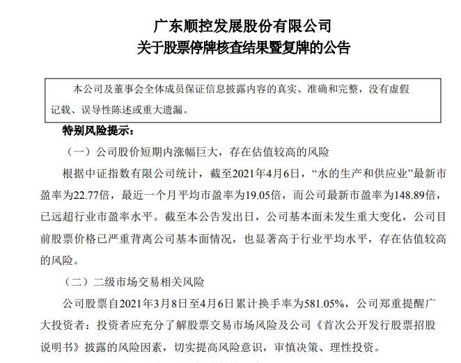 顺控发展还提示风险称,截至4月6日,“水的生产和供应业”最新市盈率为22.77倍,最近一个月平均市盈率为19.05倍,而公司最新市盈率为148.89倍,已远超行业市盈率水平。截至本公告发出日,公司基本面未发生重大变化,目前股票价格已严重背离公司基本面情况,也显著高于行业平均水平,存在估值较高的风险。