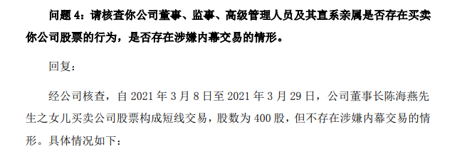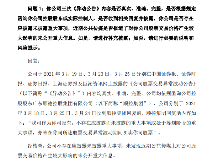 3月31日,顺控发展回复深交所称,经核查,不存在应披露而未披露的重大事项,也不存在处于筹划阶段的重大事项。同时,自3月8日至3月29日,公司董事长陈海燕女儿买卖公司股票构成短线交易,股数为400股,但不存在涉嫌内幕交易的情形。