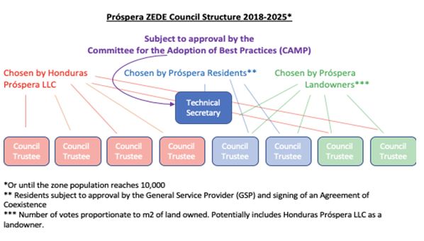 根据 Próspera 的项目书,区域的最高执政者叫做“技术秘书长” Technical Secretary,而负责区域的实际日常运营工作的管理当局,叫做“受托人理事会”。除此之外,作为项目的“推广和运营者”,一家注册在美国的实体 Honduras Próspera LLC(以下简称 LLC)——也会参与到区域的事务当中。