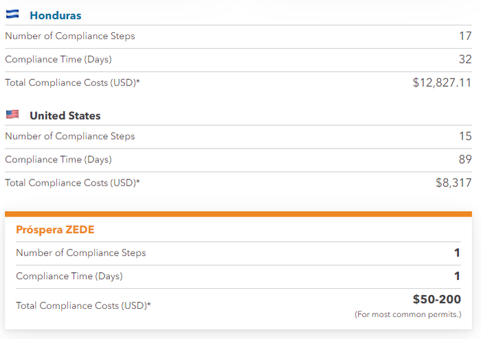 一些经营特定业务的公司所需的特许执照,在 Próspera 申请只需一个步骤,填一张1~2页的表格,审核时间一天,费用$50~200不等——相比美国的$8317和洪都拉斯的1.3万美元,简直可以说是不要钱随便给了……