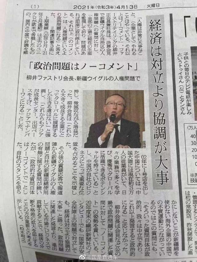 据日本纤研新闻4月13日报道,在迅销集团(优衣库母公司)业绩发布会上,有记者问道如何看待所谓新疆“人权问题”时,优衣库创始人柳井正说道,“我们在监视全部的工厂和棉花的生产,一旦发现问题就会与对方停止合作。除此之外,与其说是人权问题,更贴近政治问题。”“人权是非常重要的事情,作为企业我们正在做我们能做的事情,对于其他事情不予置评”。当记者问道如何看待不使用新疆棉的外资企业被中国消费者抵制时,柳井正表示,该问题本身带有政治色彩,我们保持中立态度。此外他还表示,优衣库在日本国内和中国市场目前发展形势较好,虽然营业额有微弱的减少,但利润额有增长,今后也会将发展重心放在亚洲,争取成为亚洲第一。