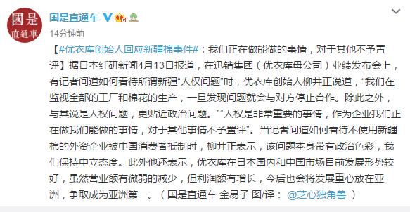 优衣库创始人回应新疆棉事件:我们正在做能做的事情