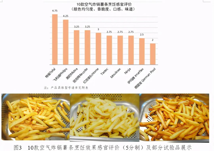 在烹饪表现中,烹饪薯条感官评价得分排名前三有:特福Tefal( FX202D)、飞利浦Philips( HD9743/11)、美的Midea(MF20B)、 丽克特Recolte(RAO-1)。