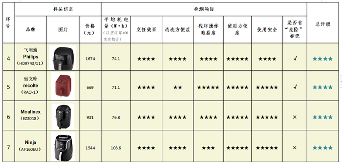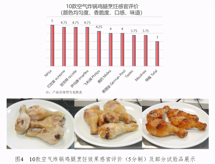 感官评价的方法为:实验员根据样本说明书的指引及随设备提供的食谱,将建议的食材分量放入空气炸锅中,然后选择推荐的烹饪温度及时间,测试食物包括薯条、鸡腿及春卷。同时测试空气炸锅运作时的耗电量,计算烹饪每100克食物的耗电量。最后由3位实验员从食物的色泽均匀度、香脆度及口感进行打分评价。