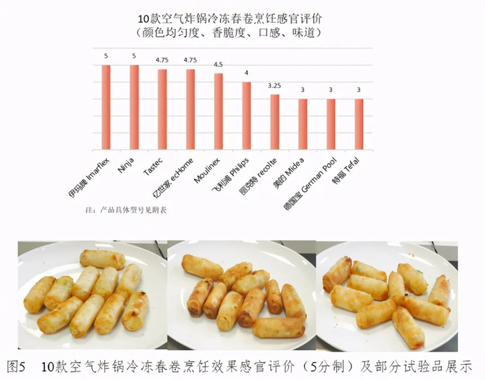 在烹饪冷冻春卷实验中,每款样品测试10条冷冻春卷(每条约25克)。所有待测试的春卷在-18℃±2K的条件下保存24小时后,根据产品使用说明设置温度(查看是否进行温度和预热),然后将10条春卷均匀地放入空气炸锅中。如果使用说明中有要求,则在烹饪过程中将春卷转动一次。在建议的烹饪时间结束时取出春卷。然后评估所有春卷的颜色均匀度、香脆度、口感和味道。