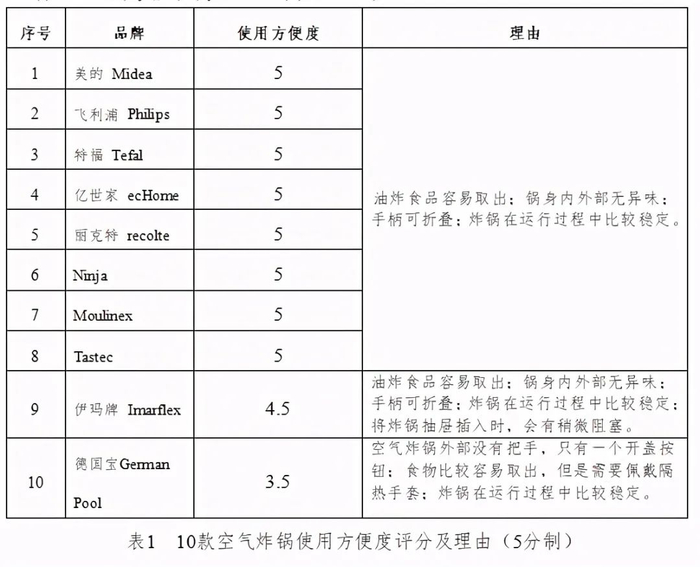 使用方便度评分规则:空气炸锅的盖子容易关闭和打开;有一个打开盖子的按钮和一个关闭盖子的把手;盖子的开口足够大,可以放得下炸篮(和食物);炸锅抽屉插拔很容易;抽屉或锅柄在操作时可折叠;油炸食品很容易取出,没有特别的气味或过量的蒸汽;空气油炸锅在运行过程中是非常稳定的。测评结果如下: