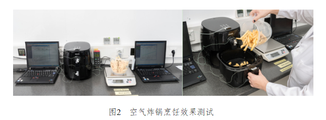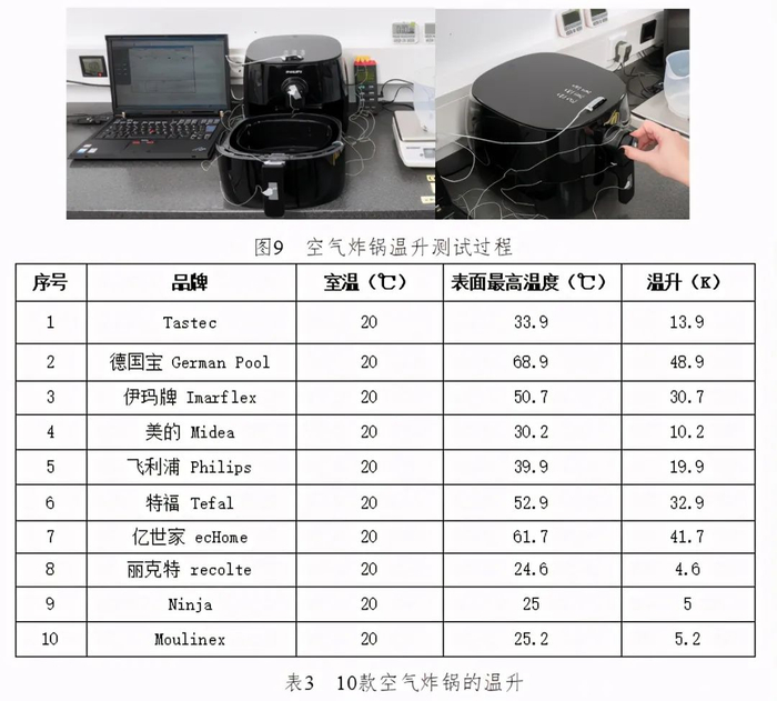 参照国际安全标准IEC 62335-1、IEC 62335-2-9及EN13732-1,在3次油炸测试(薯条、鸡腿和春卷)中测量测试点的表面温度:设置温度的按钮、抽屉把手,机身把手或盖子打开的按钮。如果机身或者盖子上没有把手,则需要在用户手指停放的位置边缘上进行测量。得到工作时外壳的最高温度,同时计算其温升,测试样品隔热效果。