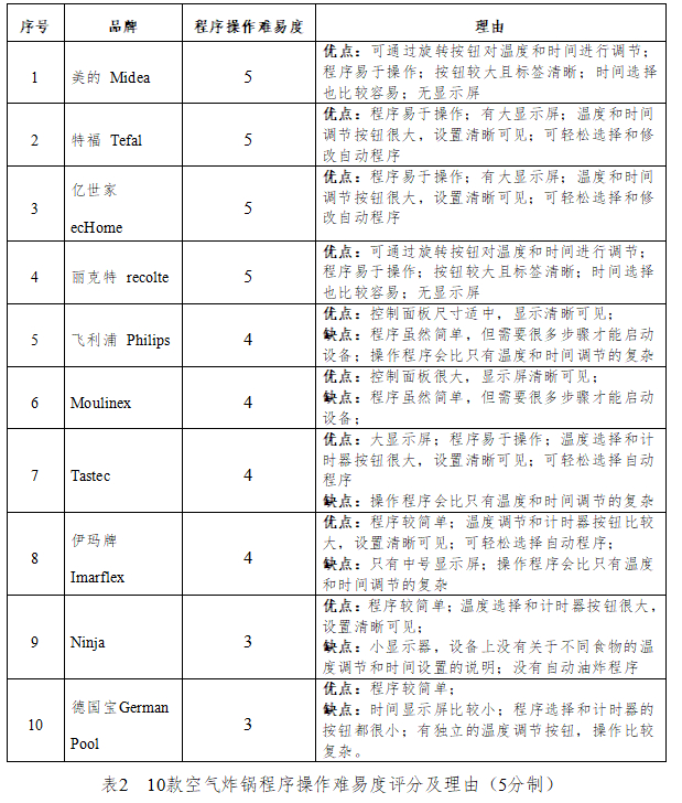 程序操作难易度评分规则:程序应简单易懂;按钮和控件应较大,且标签清晰;温度和时间应容易选择;电器上有关于油温选择或油炸温度的明确说明;应存在显示屏(计时器或温度)。