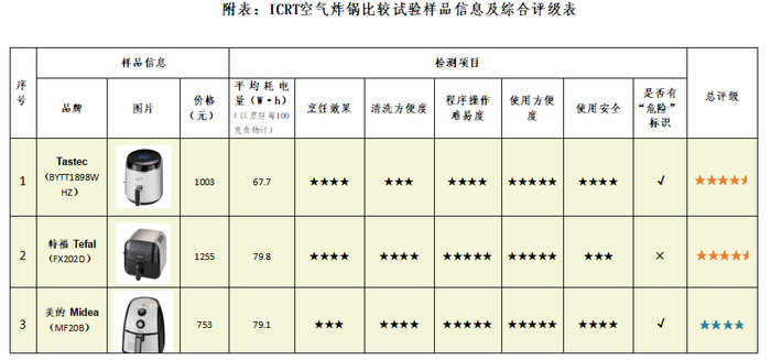 那么对于市面上众多产品,消费者如何才能选到更理想、性价比更高的产品呢?近期,国际消费者研究及测试机构(ICRT)公布了空气炸锅的比较试验结果,深圳市消委会结合国内消费者的消费热点,从中选取了具有知名度较高且商超或网络平台可购买的10款不同品牌及型号的空气炸锅,一起来看看结果吧~