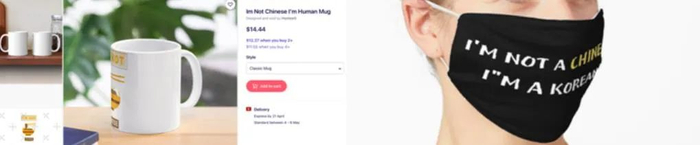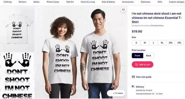 在国外创意商品平台Redbubble(译名:红色泡沫)上,最近悄然出现了大量带有歧视华人意味的T恤衫。