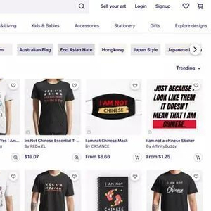 用户在Redbubble网站输入“I am not Chinese(我不是华人)”的关键词搜索,页面上就会出现各种各样印有亚裔细分字样的产品。