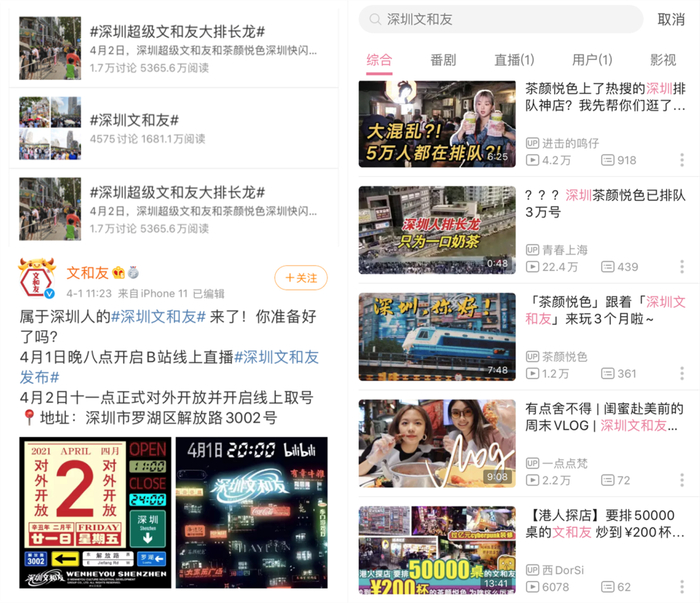 图|深圳文和友在微博、B站等社交平台利用官方账号及各种大V博主进行造势宣传