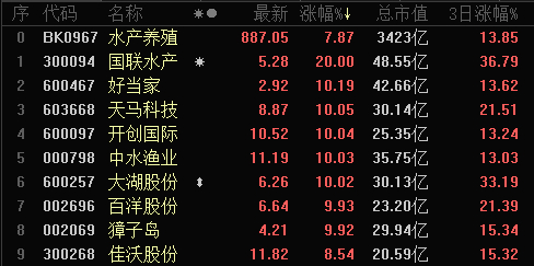 另一方面,市场普遍认为,将核废水倒进太平洋,在季风和洋流作用下,将对我国海域的海洋生物造成一定影响。受此消息影响,国内水产养殖企业受到资本市场追捧。13日,截至收盘,Wind水产指数上涨9.26%,A股水产养殖股继续强势爆发,8股涨停,龙头大湖股份已实现三连板。