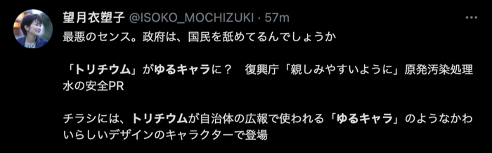 “复兴厅把放射性氚弄了个所谓的‘吉祥物’,这真的是令人目瞪口呆的事。但重点是这波操作误导人觉得核污水中只含有放射性氚,还成了既定事实了,这更是令人目瞪口呆。自民党政府宣称是‘处理水’,但即使是经过了处理,核污水中锶90也超标了啊。”