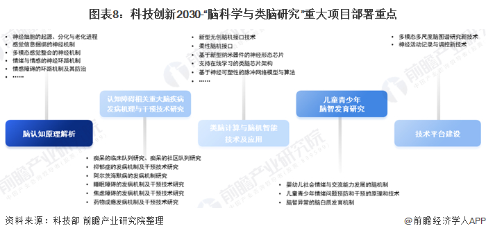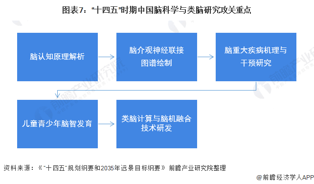 根据《“十四五”规划纲要和2035年远景目标纲要》,“十四五”期间,我国脑科学与类脑研究将围绕脑认知原理解析、脑介观神经联接图谱绘制、脑重大疾病机理与干预研究等五项重点: