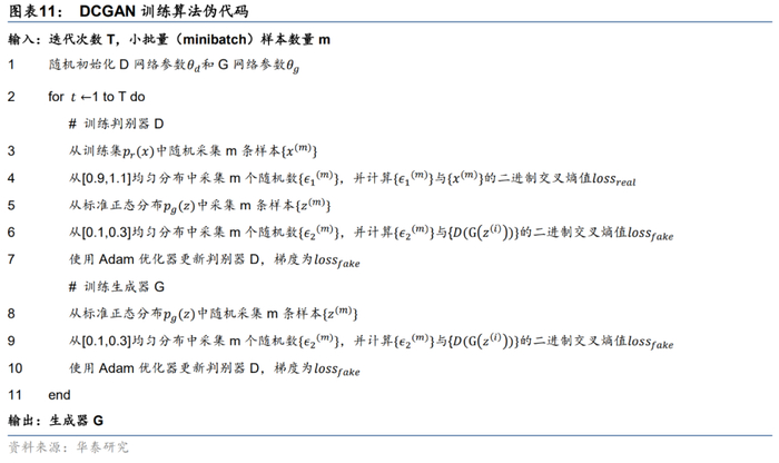 在DCGAN的实际训练过程中,判别器D与生成器G交替进行训练,判别器D训练1次,生成器G训练1次。DCGAN训练算法的伪代码如下所示。