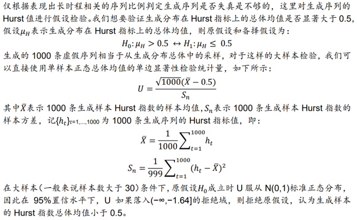 在上述假设检验下,DCGAN、W-DCGAN与对照组WGAN生成的1000条序列检验结果如下表所示。W-DCGAN模型1000条生成序列的Hurst均值假设检验统计量为68.78,充分远离拒绝域;DCGAN模型检验统计量为-712.20,WGAN模型检验统计量为-5.48,落在拒绝域中,可以认为DCGAN和WGAN模型的Hurst均值小于0.5。因此仅有W-DCGAN生成序列复现出了真实序列的长时程相关特性。