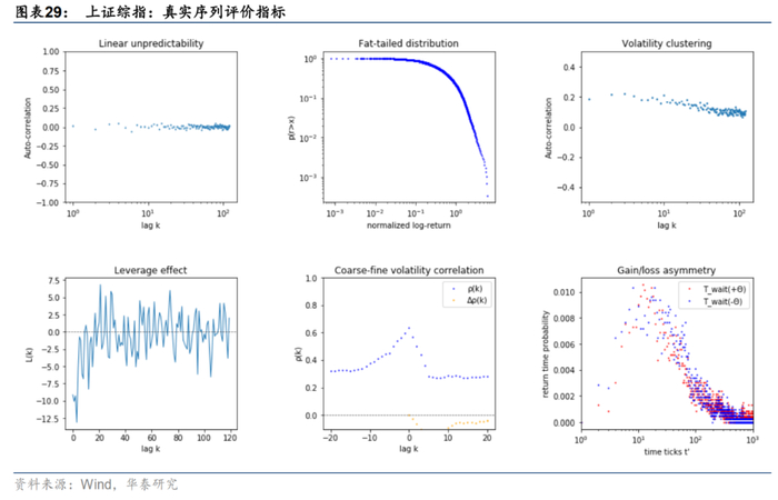 1. 自相关性:左上子图为收益率k=1~120阶时滞自相关系数,各阶时滞自相关系数接近0,表明真实收益率序列不存在显著的自相关性。