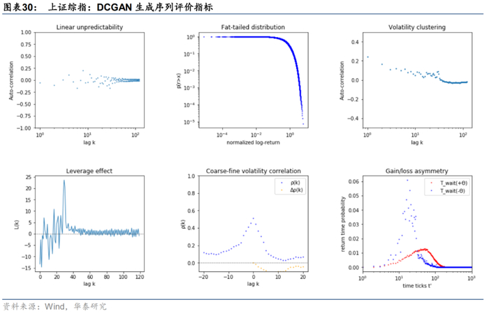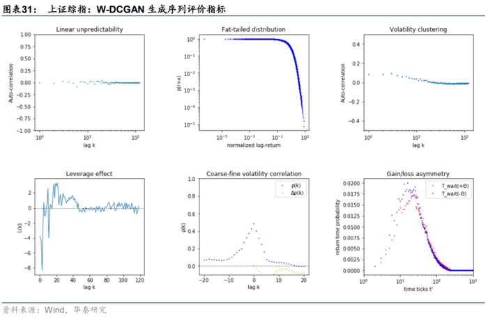 我们使用训练好的DCGAN随机生成1000条多资产收益率序列,从中提取上证综指对应的收益率序列,计算1000条序列前6项单资产序列评价指标并求均值,最终汇总计算结果如下图所示。结果表明,DCGAN的生成效果不理想,难以准确复现自相关性(左上子图)、杠杆效应(左下子图)和盈亏不对称性(右下子图)。