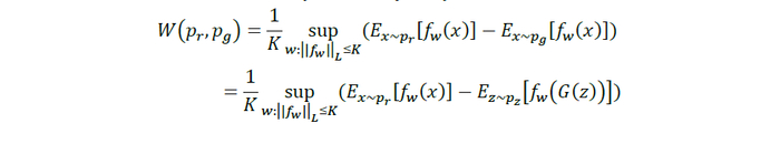 Arjovsky等(2017)使用Wasserstein 距离(简称W距离)替代GAN所使用的JS散度,这样构建的生成对抗网络称为WGAN。W 距离的原始数学定义在实践中难以直接计算,可通过Kantorovich-Rubinstein Duality公式(Arjovsky,2017)将其等价变换为下式: