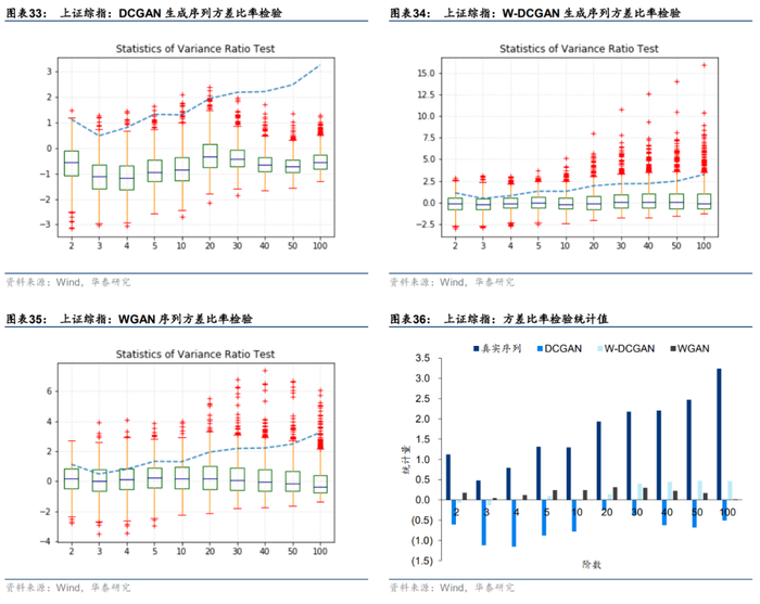 下面展示各模型在方差比率检验指标上的表现。图表33至35中的蓝色虚线表示真实序列各阶方差比率检验统计值,箱线图代表1000条生成序列在各阶方差比率检验统计值分布。真实序列表现出短期(阶数2~10)随机游走,即低阶方差比率检验统计量落在[-1.96,1.96]的范围内;高阶(阶数50~100)非随机游走,即高阶方差比率检验统计量落在[-1.96,1.96]的范围外。总体来说,DCGAN 、W-DCGAN与WGAN 的生成序列都未能完美复现出这一特征,但W-DCGAN生成序列的方差比检验统计量与真实序列更为接近。
