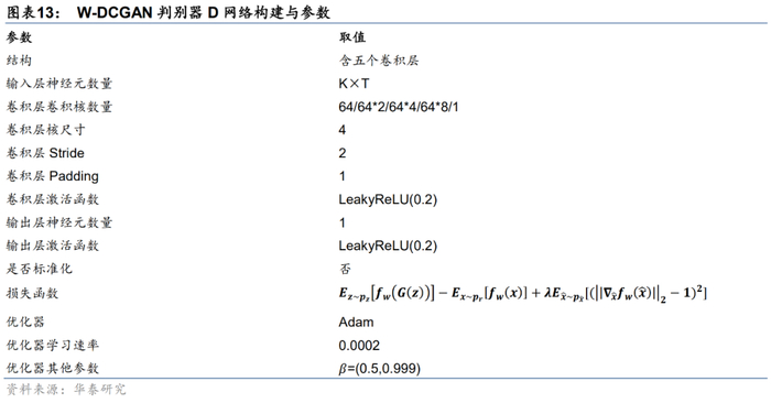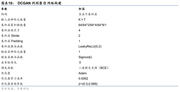 判别器D网络使用含五个卷积层的全卷积网络结构。在多资产生成的应用场景下,为了使D具有鉴别多资产序列的能力,我们将第一层卷积层设置为多通道输入,每一通道对应多资产序列中的一个标的资产。D网络具体参数详见下表。