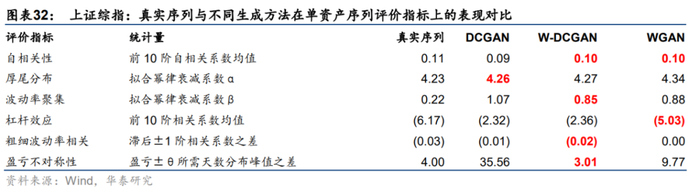 我们使用训练好的W-DCGAN随机生成1000条多资产收益率序列,从中提取上证综指对应的收益率序列,计算1000条序列前6项单资产序列评价指标并求均值,最终汇总计算结果如下图所示。结果表明,W-DCGAN能够较好地复现真实序列的各项典型化事实。