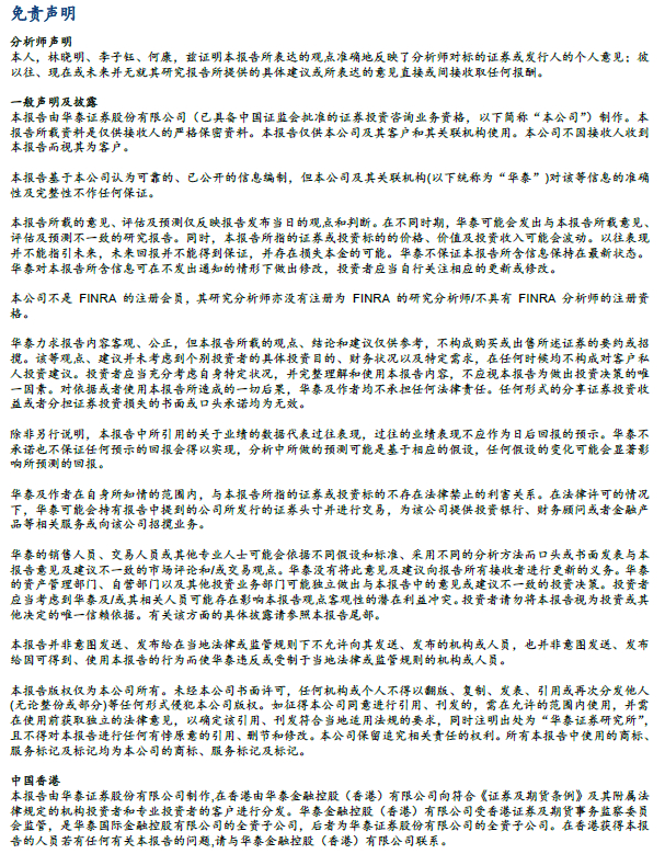本公众平台不是华泰证券研究所官方订阅平台。相关观点或信息请以华泰证券官方公众平台为准。根据《证券期货投资者适当性管理办法》的相关要求,本公众号内容仅面向华泰证券客户中的专业投资者,请勿对本公众号内容进行任何形式的转发。若您并非华泰证券客户中的专业投资者,请取消关注本公众号,不再订阅、接收或使用本公众号中的内容。因本公众号难以设置访问权限,若给您造成不便,烦请谅解!本公众号旨在沟通研究信息,交流研究经验,华泰证券不因任何订阅本公众号的行为而将订阅者视为华泰证券的户。